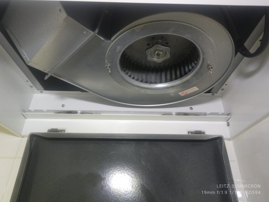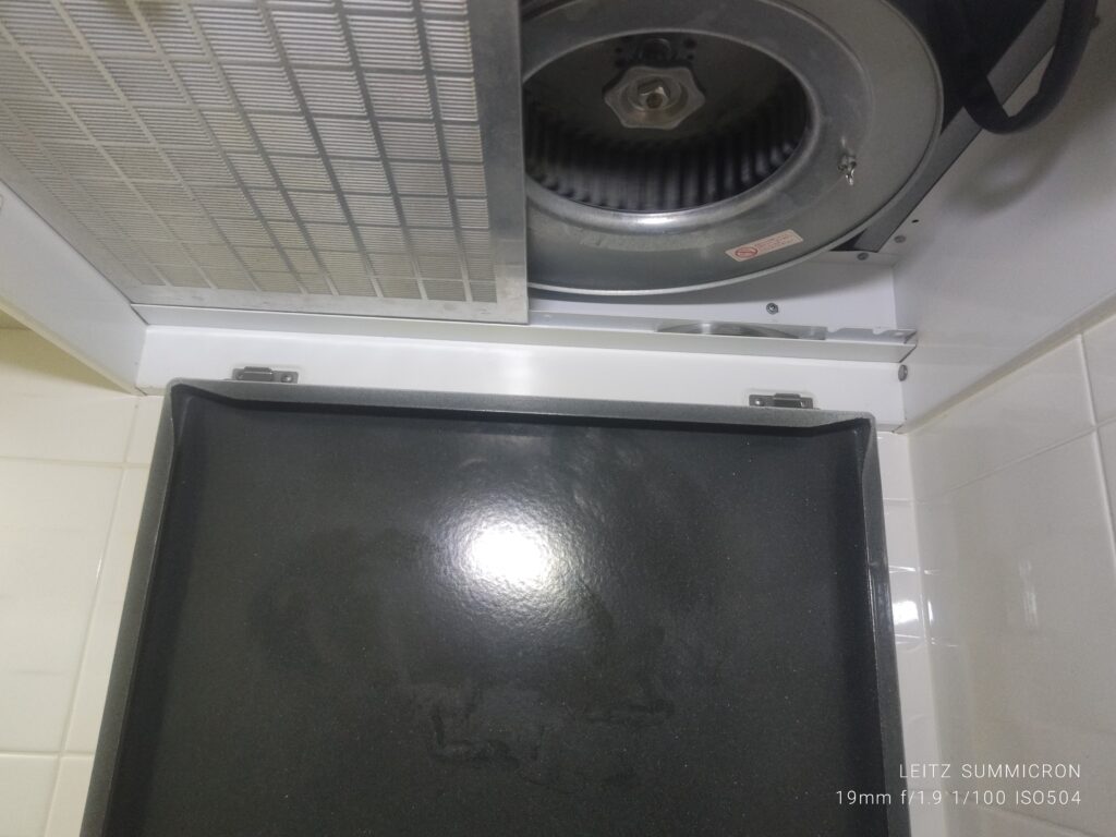 洗浄後のレンジフードとキッチン
