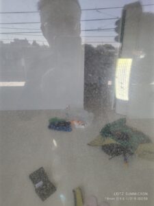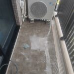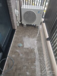 洗う前のベランダ 室外機側 6階って言うのと、ました道なので高圧は配慮しながら使う。 隣との壁が汚れてたら洗う。 下の白い部分は窓を洗ってでた汚水。 ちゃんと流した。
