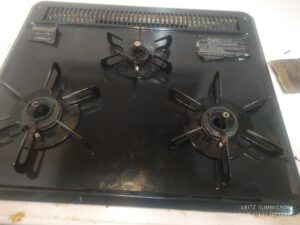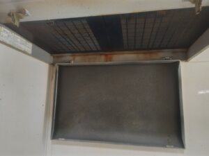 洗う前のレンジフード、油ギッシュ フィルターも油まみれ シロッコファンは可愛い方だった キッチンもこれから綺麗にいたします