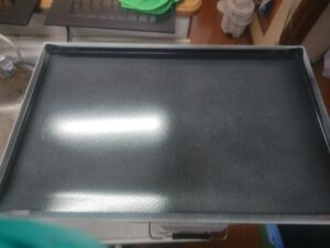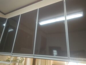 レンジフードの天井洗って、そのまま上部の扉を全部手を入れる 角度を変えながら光の反射を見る 曇ってる場所は再度洗って全部確認して下段に。